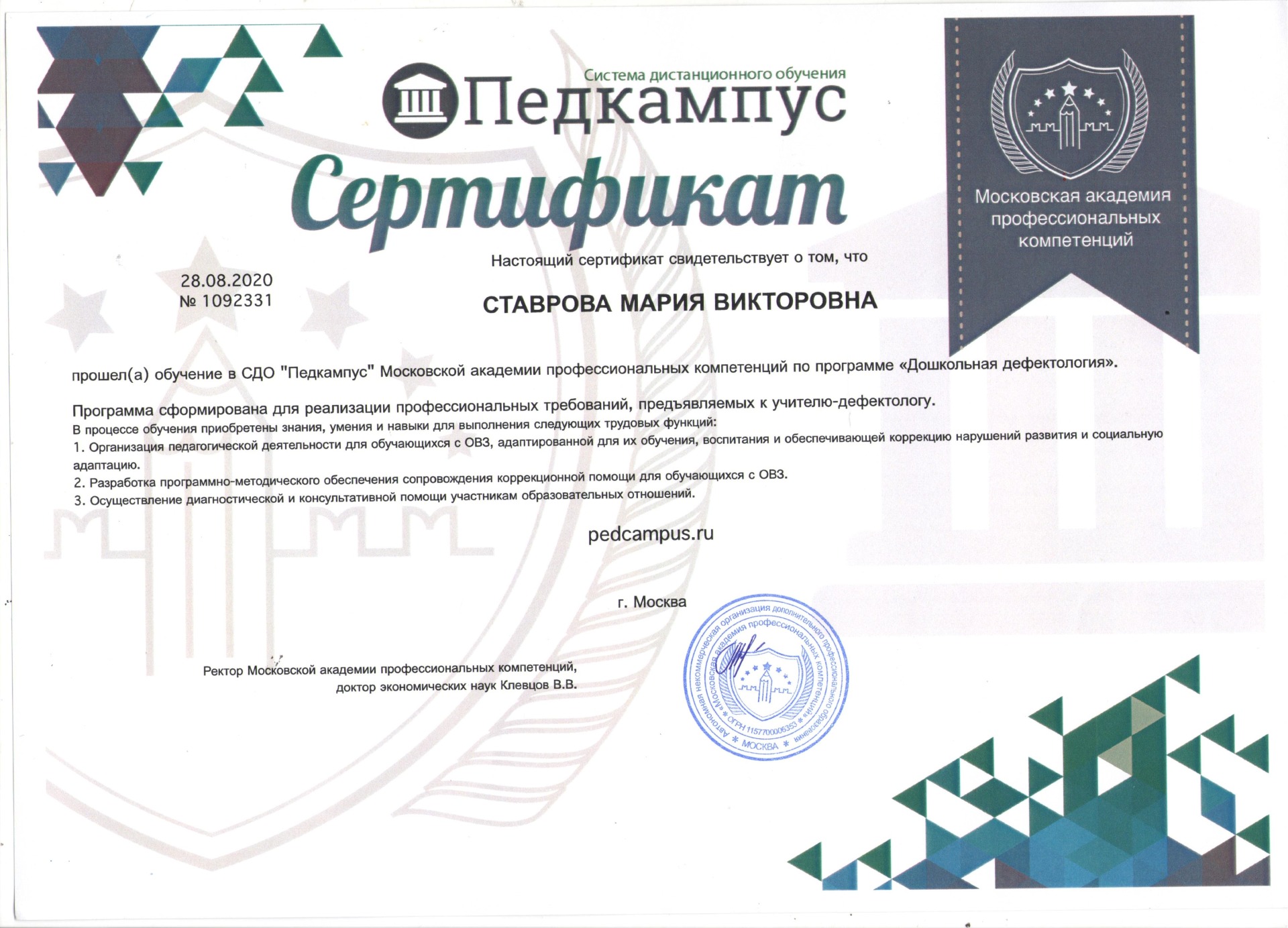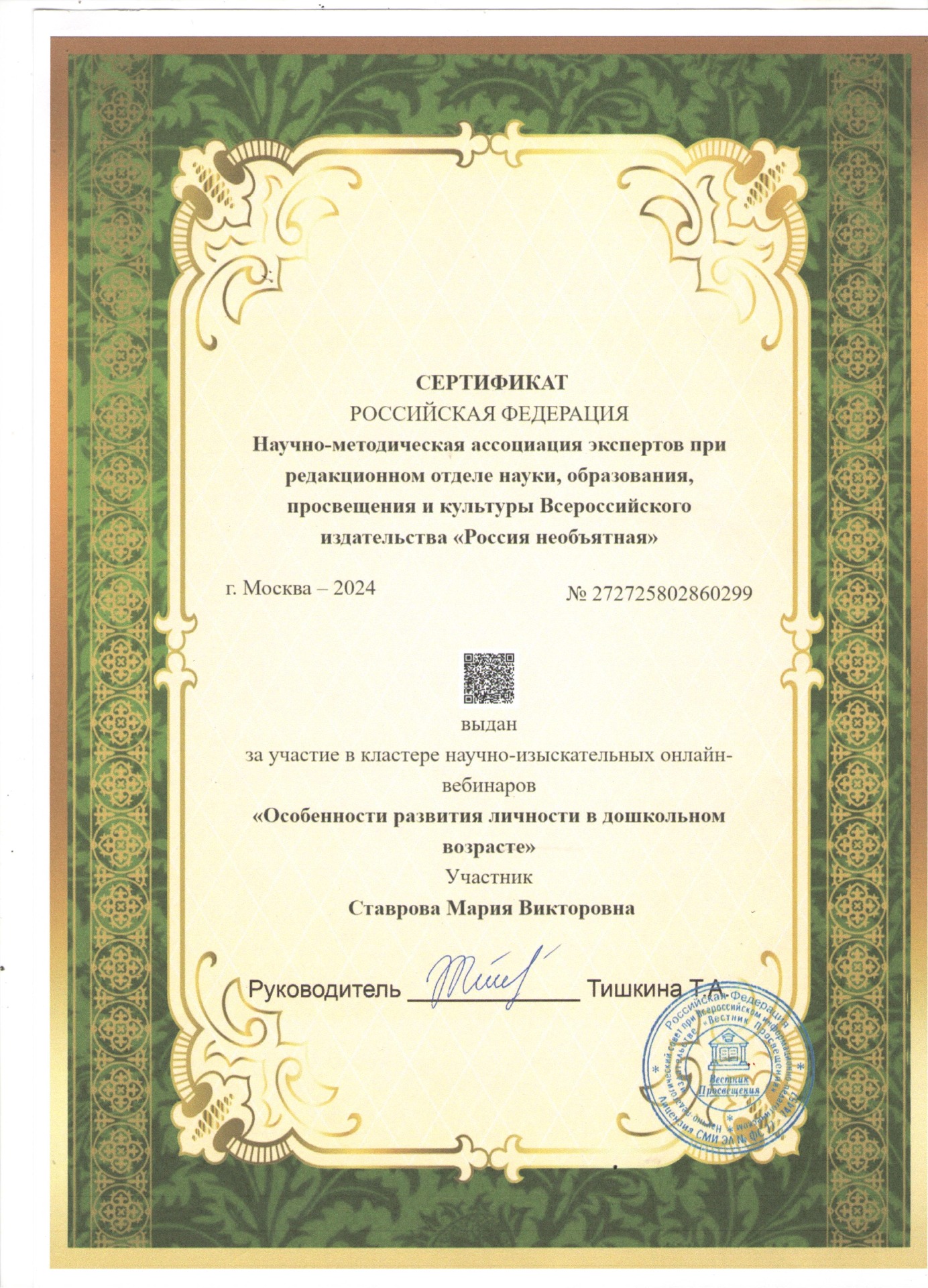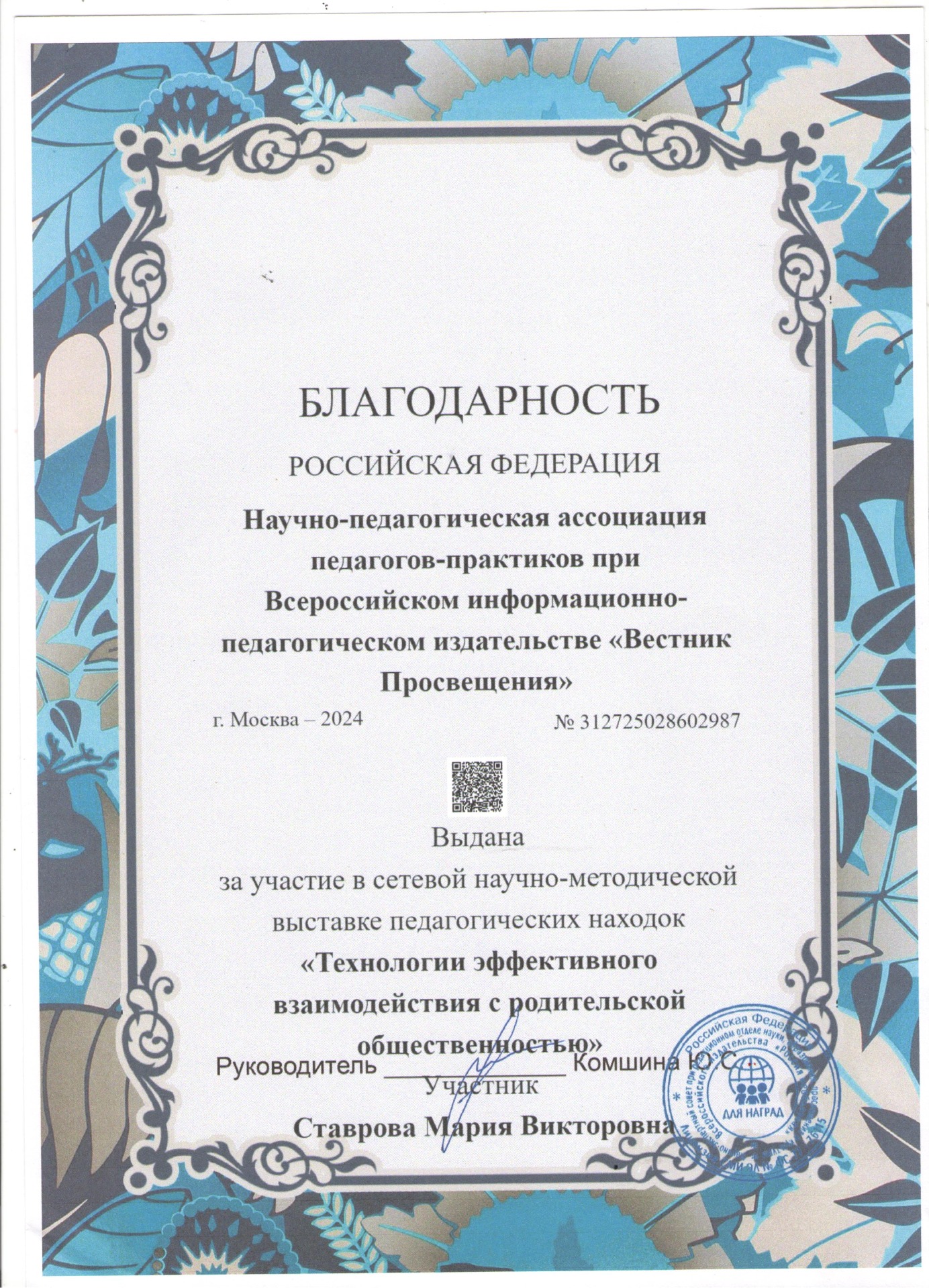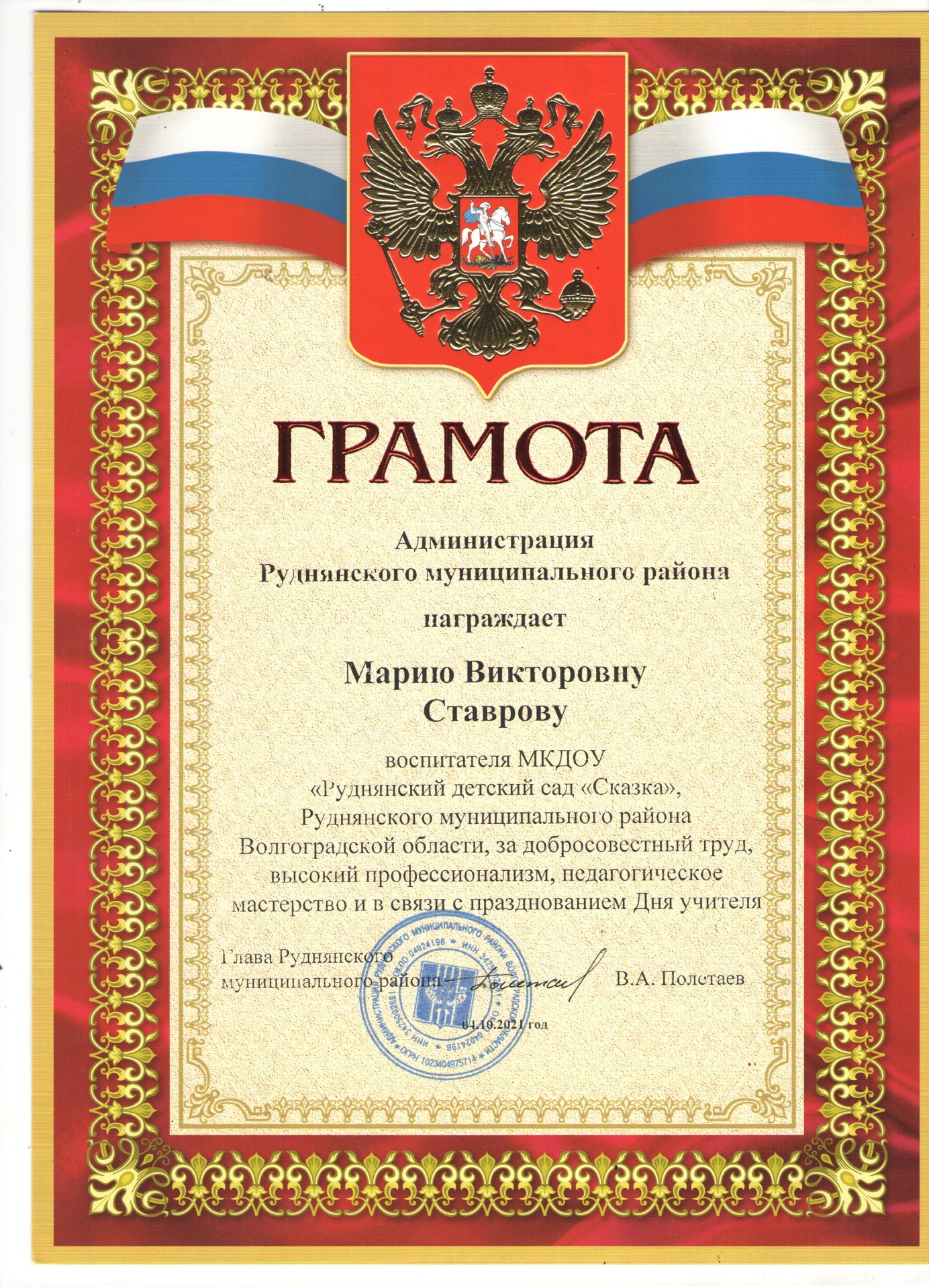 Главная Педагогический… 6. Ставрова Мария… Награждения