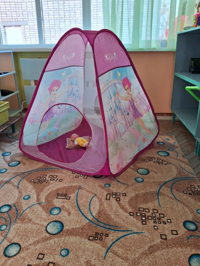 В шумном пространстве игровой комнаты обязательно есть островок тишины и спокойствия — уголок уединения, который располагает к созерцательному наблюдению, мечтам и тихим беседам. Хотя он отделен от других центров легкой шторкой, ширмой ребенок чувствует себя здесь спокойно и уютно. Этому способствуют комфортное кресло, мягкие игрушки